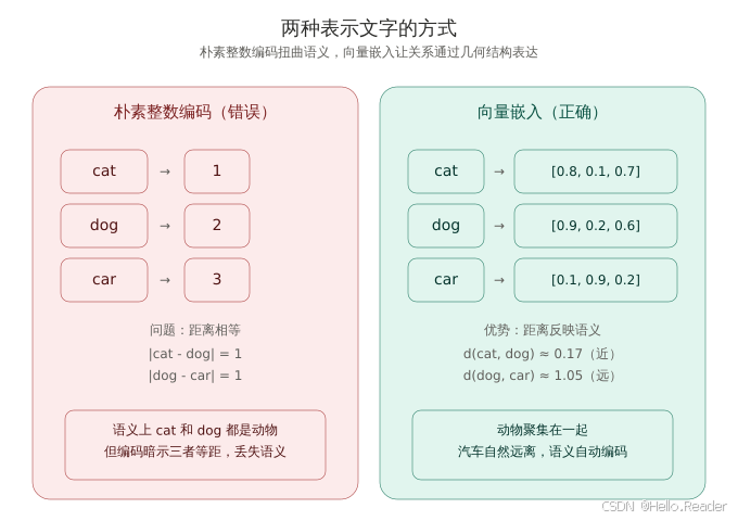 图1:同样是三个词,朴素整数编码让距离失去语义;向量嵌入则让语义关系通过几何距离自然表达。