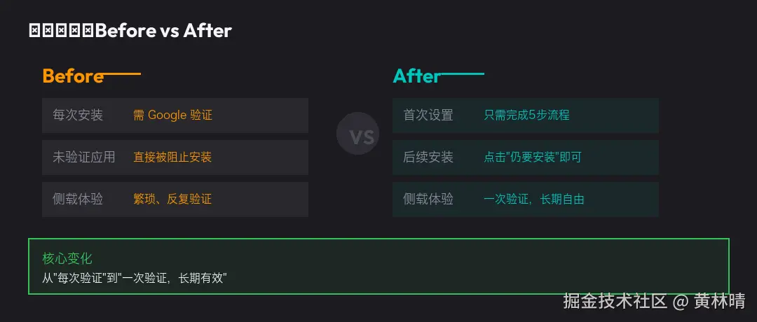 以后侧载应用,不用再被繁琐的验证流程折磨了。