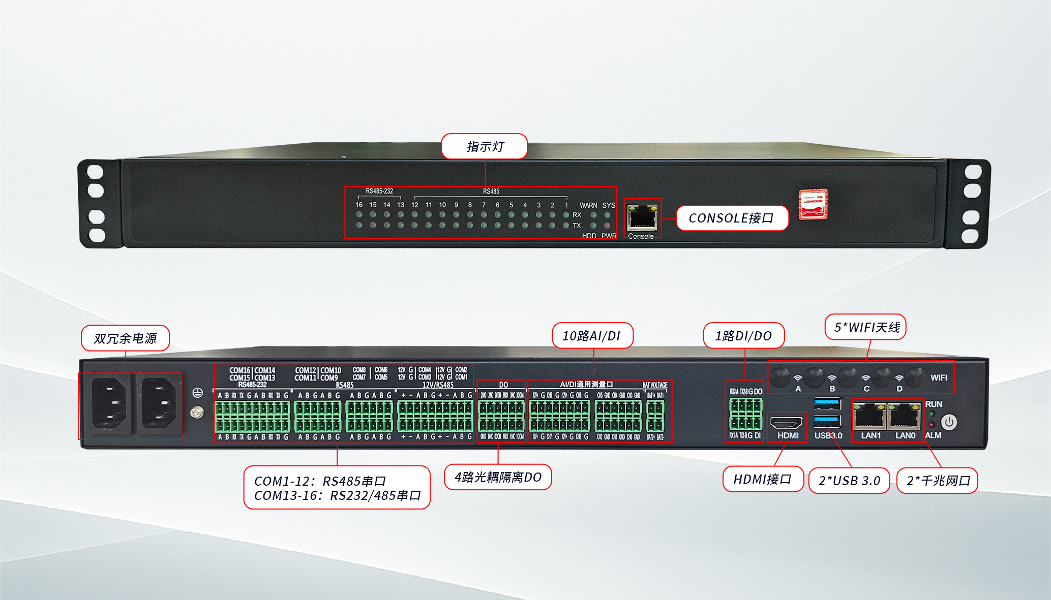 高密度扩展:通过扩展板可支持最多16路串口,以及多路AI/DI/DO通道,部分串口具备12V供电输出能力,适合对接传感器与控制器。