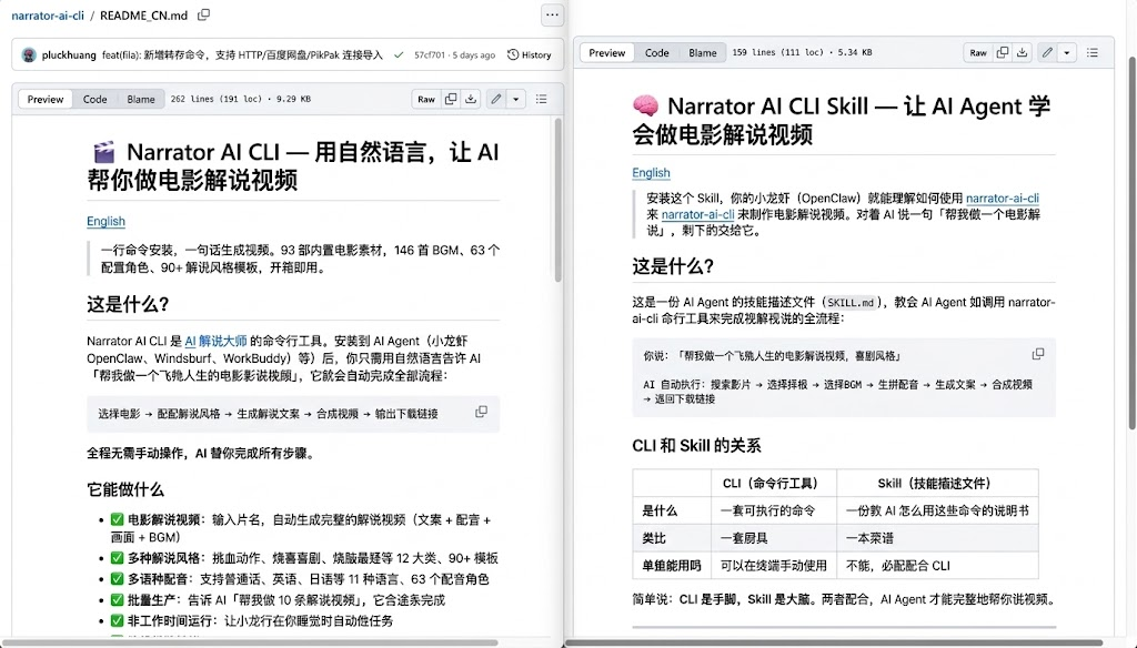 AI解说大师提供官方的 SKILL.md 文件(narrator-ai-cli-skill 仓库),适配小龙虾 OpenClaw、Windsurf、QClaw、WorkBuddy 等主流 Agent。
