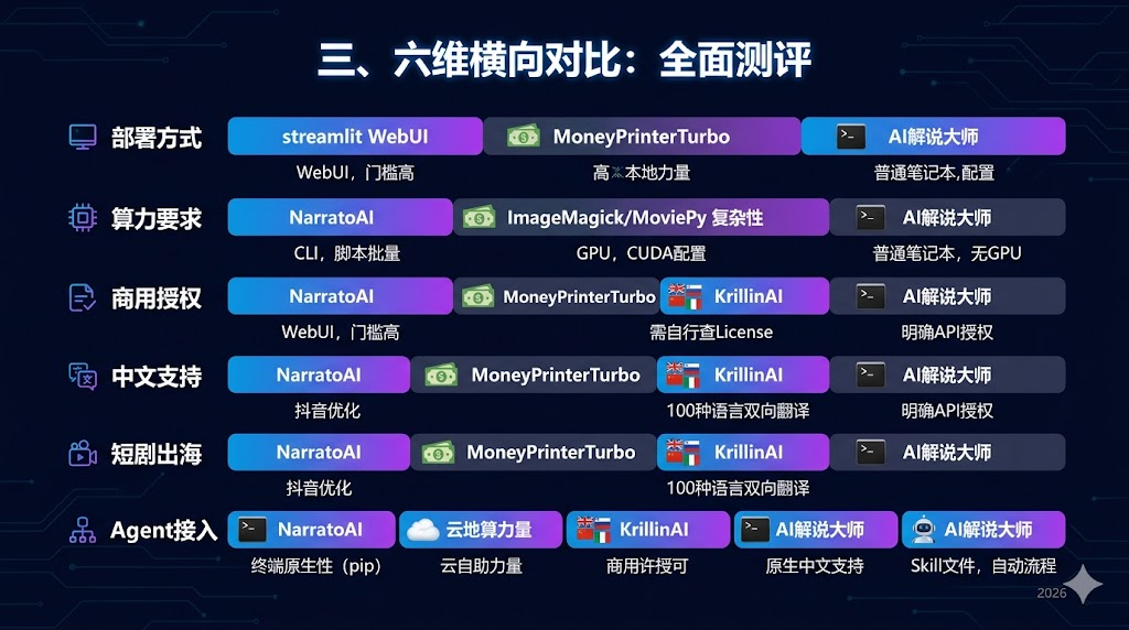 如果你手里有一部电影或剧集,需要做解说------选 NarratoAI 或 AI解说大师。如果你需要从一个关键词或主题出发自动生成短视频内容------选 MoneyPrinterTurbo。如果你已经有成片需要翻译成多语种------选 KrillinAI。