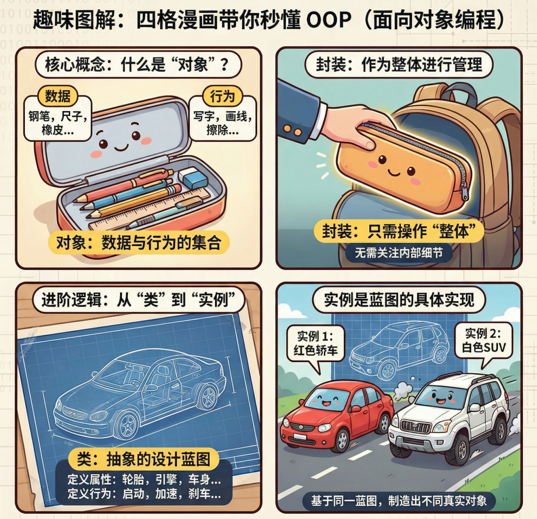 快速理解 :类就像一张设计蓝图。例如"汽车"类,上面规定了汽车应有方向盘、轮胎、引擎,以及启动、加速等功能。而对象就是根据这张蓝图制造出来的真实汽车,比如邻居家的红色轿车或街上的白色SUV。每辆车有自己的颜色、车牌号 ,但它们都具备方向盘和启动能力,因为它们都源自同一张蓝图。