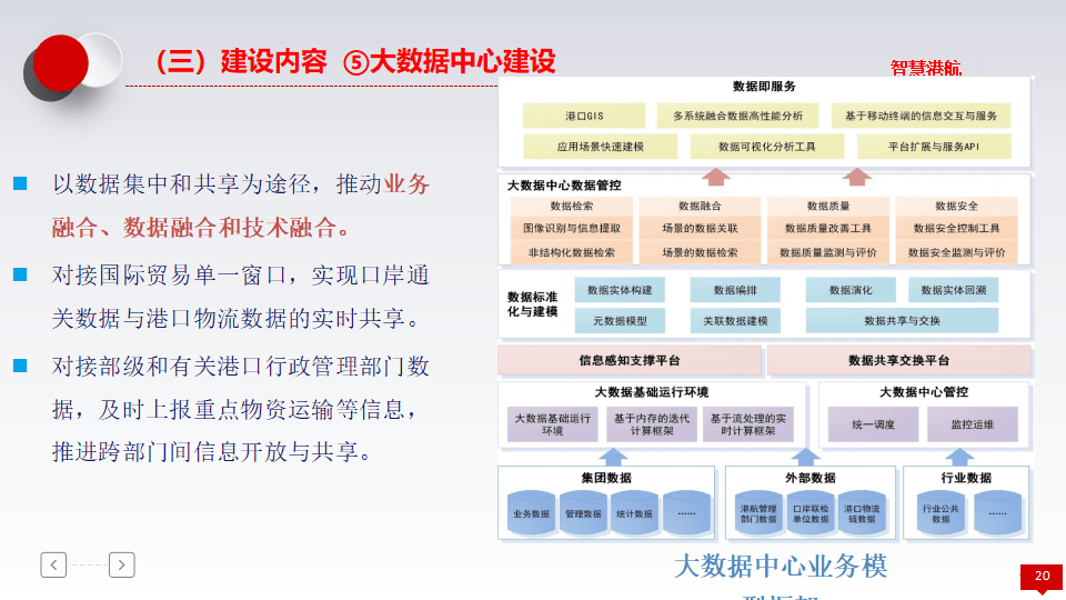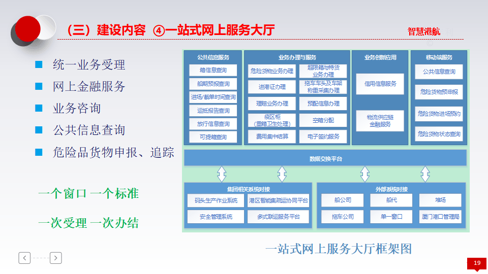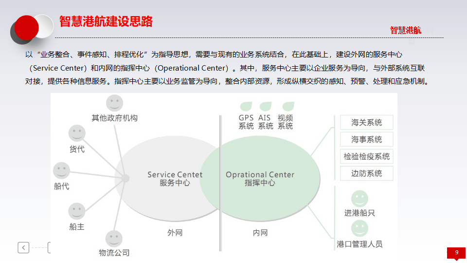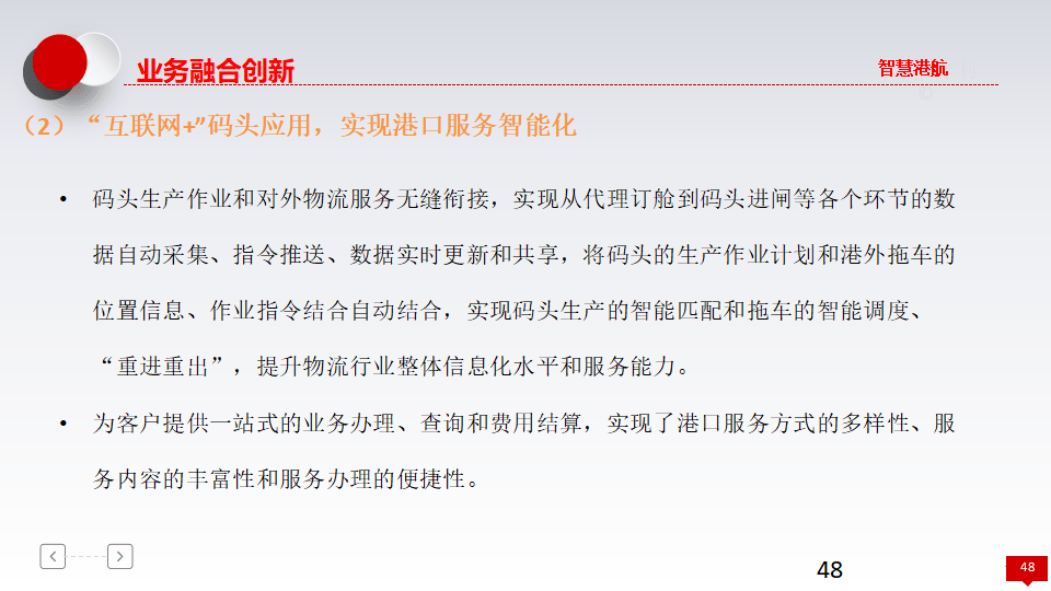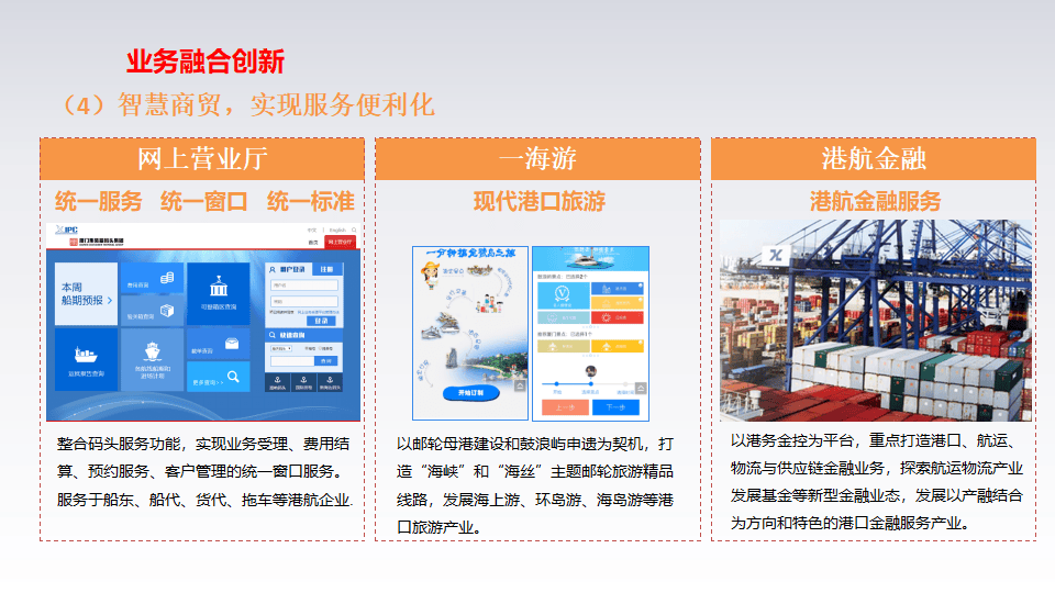 - 智慧商贸:包括网上营业厅(统一服务窗口)、现代港口旅游(发展海上游、海岛游)及港航金融(供应链金融、产业基金)。