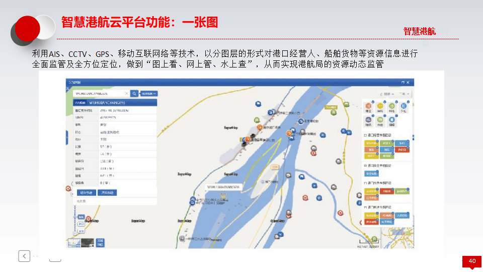 - 一张图:利用分图层形式对港口经营人、船舶货物等资源进行全面监管及全方位定位,实现"图上看、网上管、水上查"。