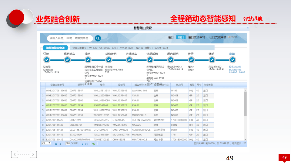 - 全程箱动态智能感知:通过智慧闸口搜索,实时查询设备交接单号、箱号、封条号、船舶动态及场位信息。