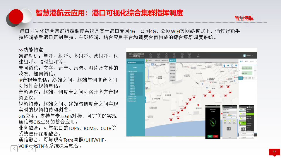 - 可视化综合集群指挥调度:基于专网/公网4G/WIFI,通过智能手持终端或车载终端,提供集群对讲、专网微信、视频拍传、GIS应用及业务融合等功能。