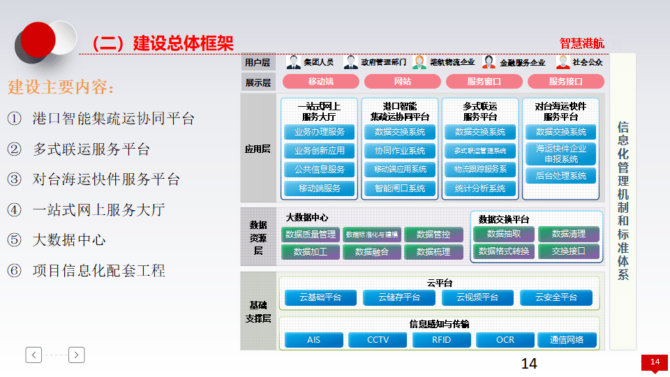 - 总体架构:包含用户层、展示层、应用层(一站式网上服务大厅、港口智能集疏运协同平台等)、数据层(大数据中心)及基础支撑层(云平台、信息感知与传输)。