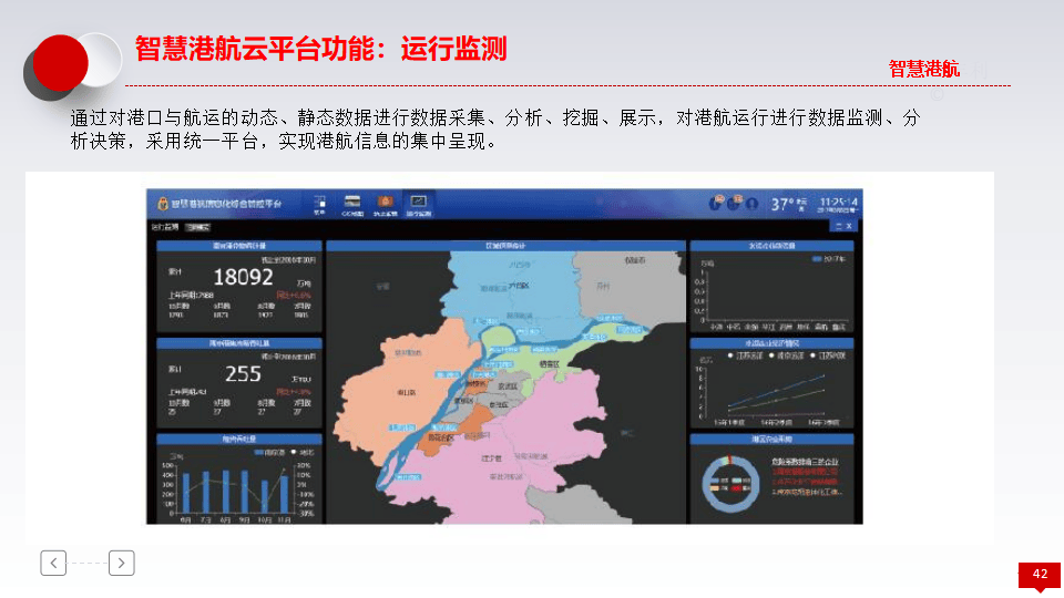 - 运行监测:对港口与航运的动态、静态数据进行采集、分析、挖掘与展示,实现信息的集中呈现。