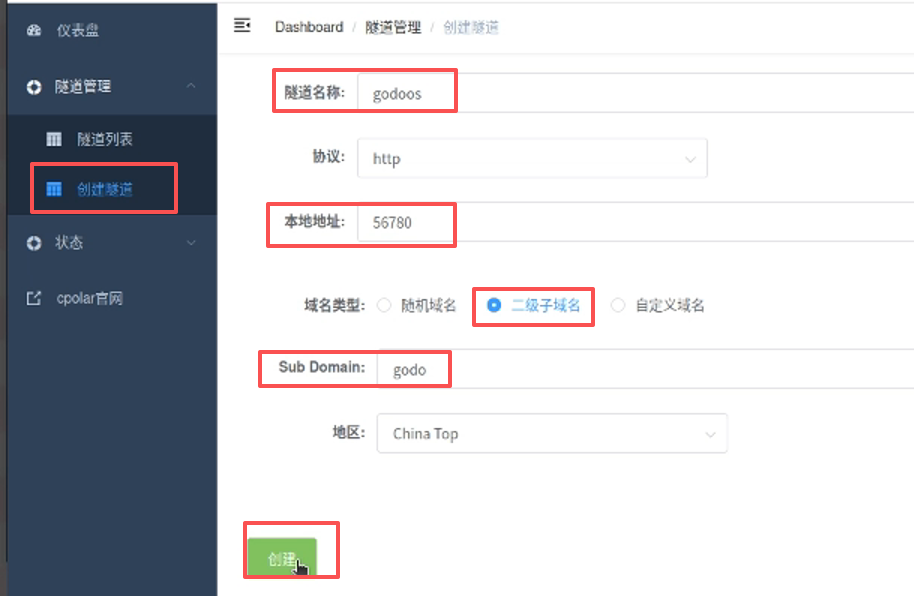 - 隧道名称:可自定义,本例使用了:,注意不要与已有的隧道名称重复