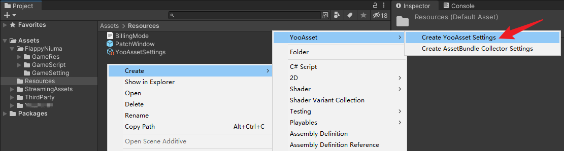 在Project面板Resources文件夹下右键创建一个YooAssetSettings。