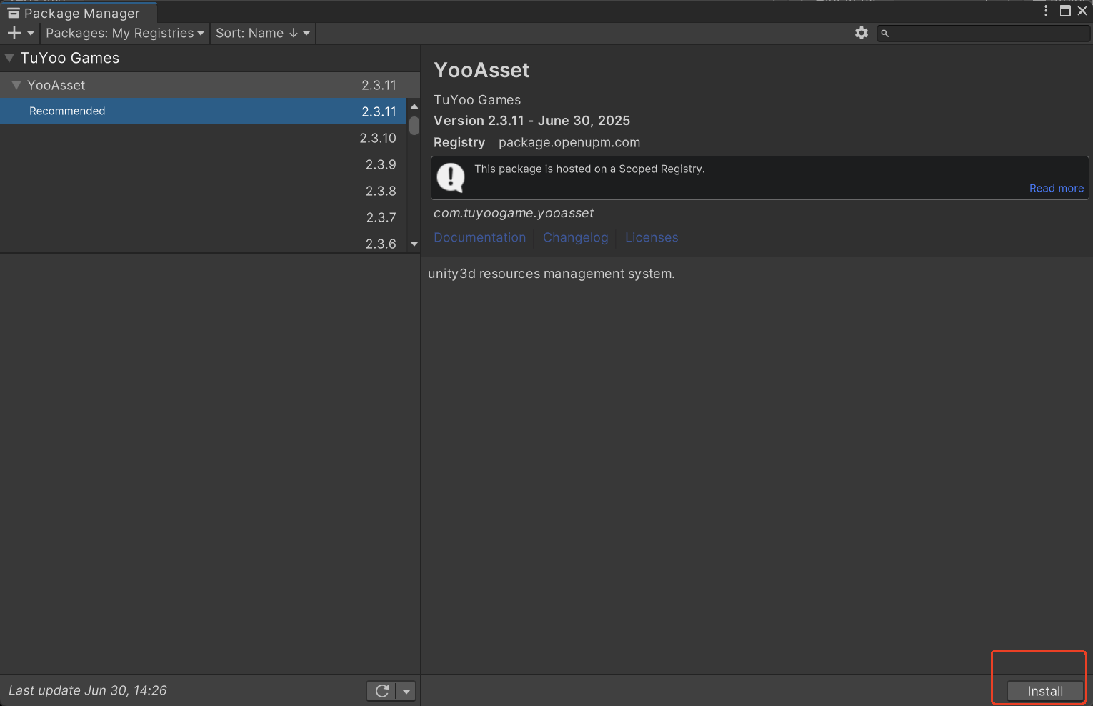 在Edit/Windows/Package Manager 的 MyRegistries 中找到YooAsset进行安装。