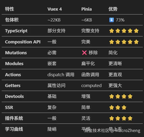 Pinia是Vue官方开发的状态管理库,使用它API更简洁,而且完美支持Vue3和TypeScript。