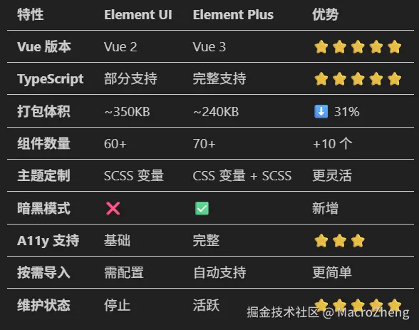 由于Element UI已经停止更新,这里升级到了支持Vue3的Element Plus组件库,两者使用过程中的特性与优缺点对比如下。