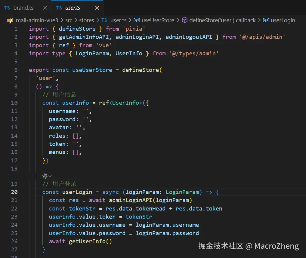 项目中的用户信息存储就使用了它,配合pinia-plugin-persistedstate插件,还可以实现数据的持久化。