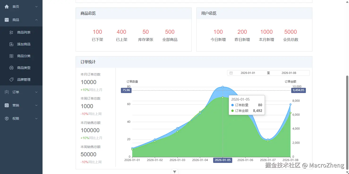 mall-admin-web是mall电商项目后台管理系统的前端项目,基于Vue3+Element-Plus实现。主要包括商品管理、订单管理、会员管理、促销管理、运营管理、内容管理、统计报表、财务管理、权限管理、设置等功能。