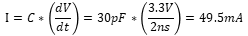 若一个负载为30pF,要在2ns内从0V驱动到3.3V,瞬态电流为: