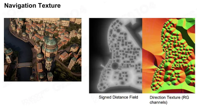 SDF的应用非常广泛,例如在下图所示游戏引擎的粒子系统中,我们可以基于SDF构建方向贴图,使运动中的粒子能够感知到自身正在接近建筑物表面,从而防止其穿透进入。