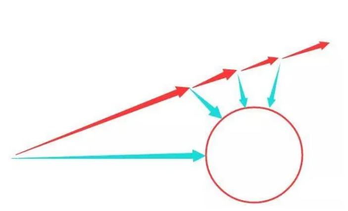 跨出第一步后,在每个新位置仍可通过SDF获取到球面的最短距离(青色箭头所示),因此可以安全地继续沿射线方向推进与青色箭头等长的步距(如下图所示)。