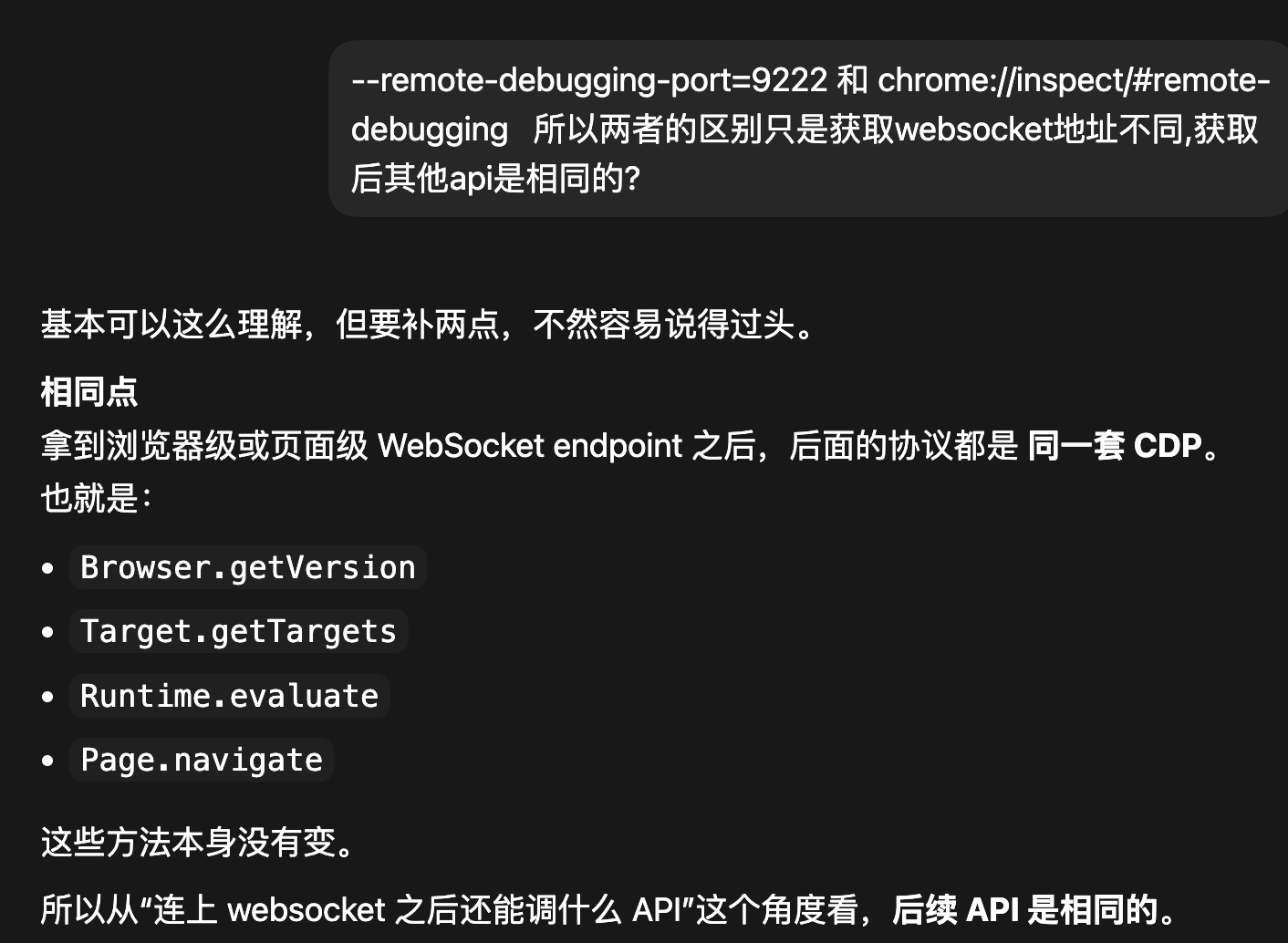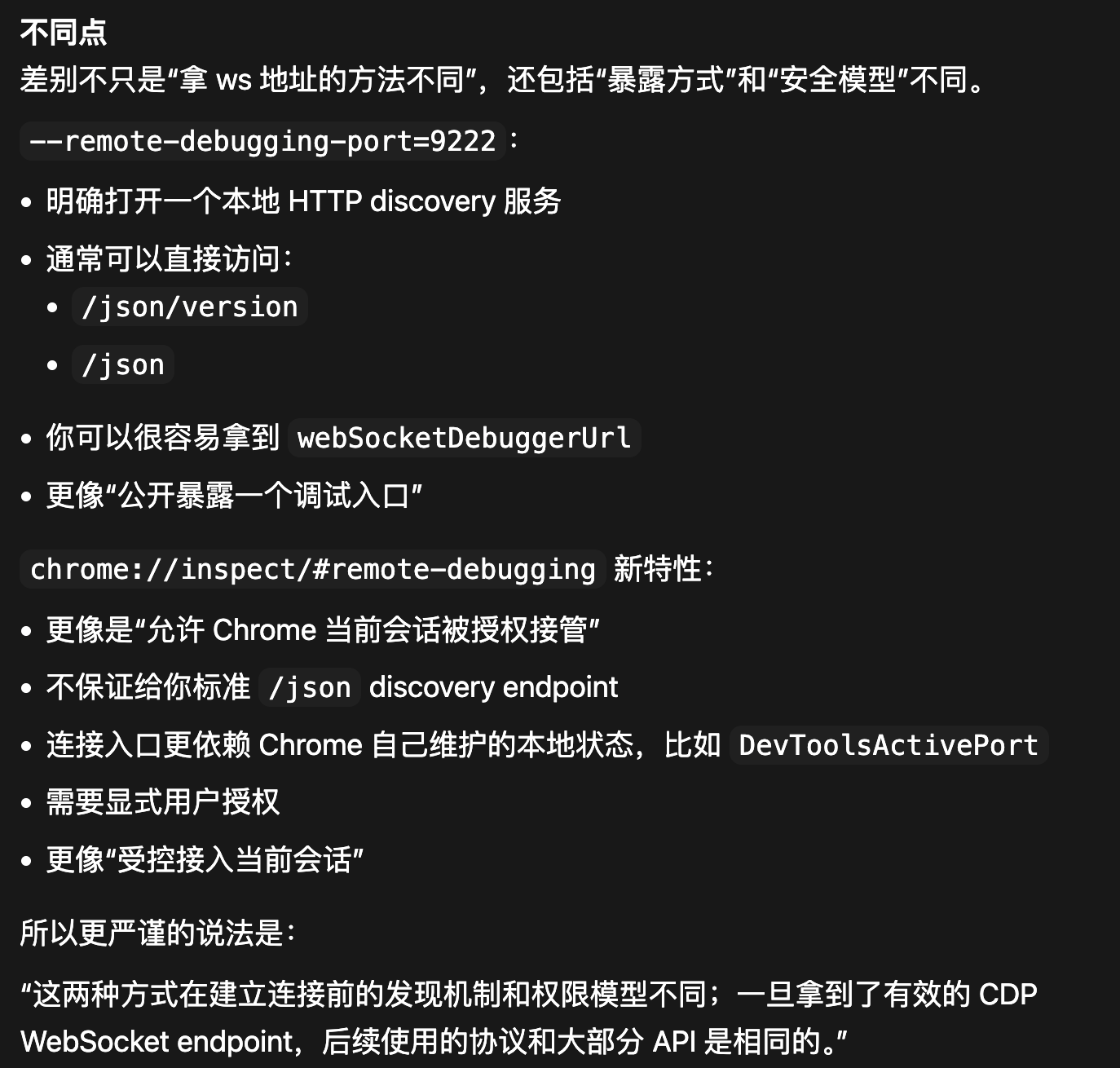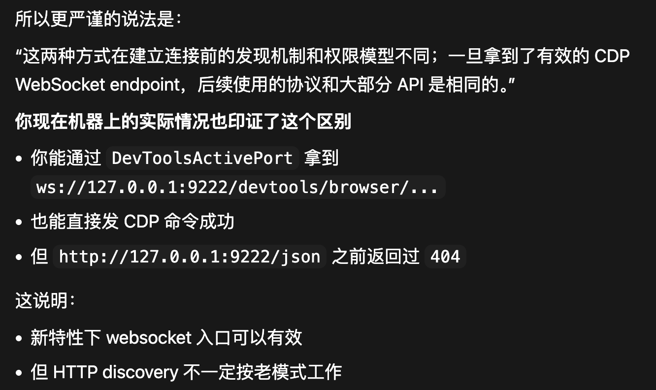 这份脚本也能顺便解释你之前的现象:在这个新特性下,/json 这类 HTTP discovery endpoint 可能不可用,但 DevToolsActivePort 给出的 browser websocket 仍然是可用的,所以不能用 curl /json 作为唯一判据。