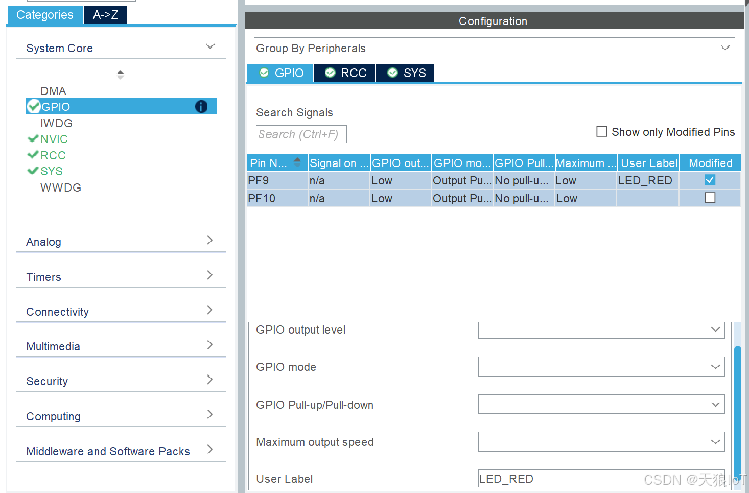 - 然后,在左侧的"System Core→GPIO"栏内,可以对引脚进一步配置。还可以一次性选中多个引脚进行配置。