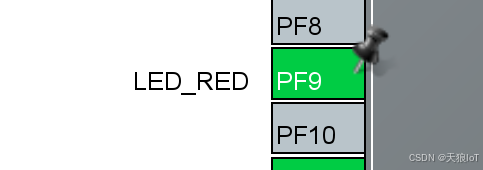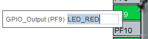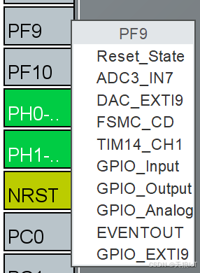- 以"PF9"引脚为例,在对应图标上单击鼠标左键后会弹出如下图所示的弹窗。其中的选项表示这个引脚的可复用模式,单纯作为GPIO的有:GPIO_Input、GPIO_Output、GPIO_EXTI、GPIO_Analog这四种模式。
