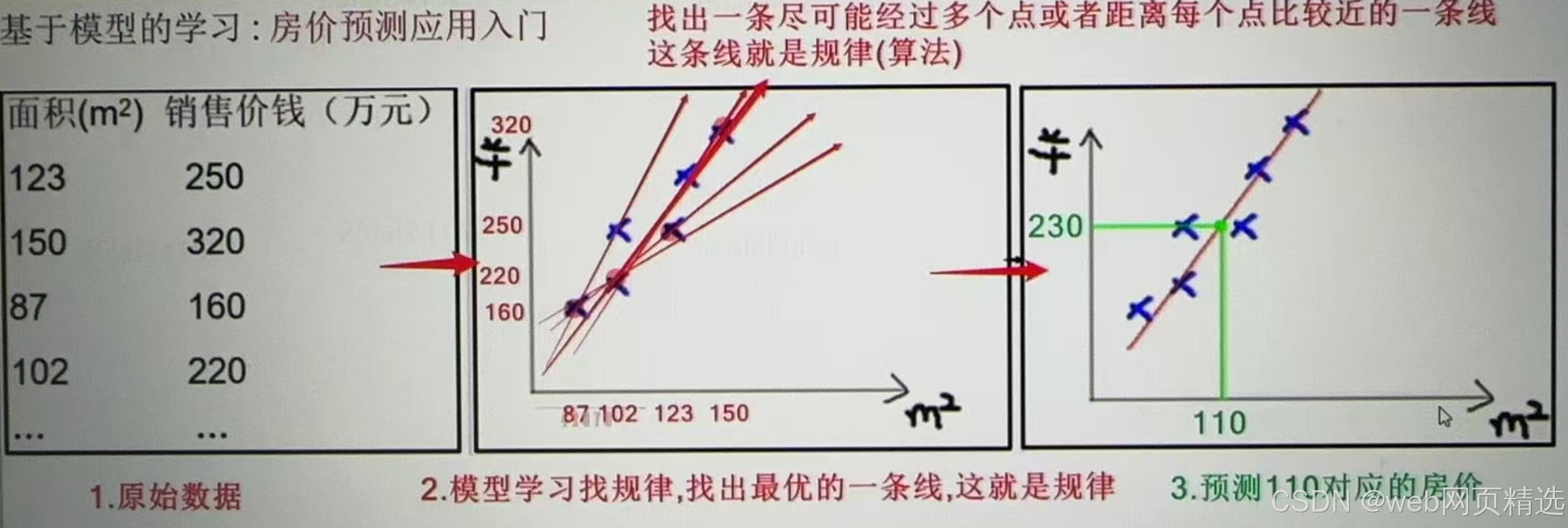 找出一条尽可能经过多个点或者距离每个点比较近的一条线,这条线就是规律(算法)