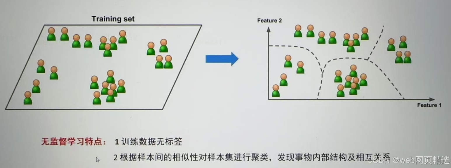 | 无监督学习 (unsupervised learning) | 无标签 | 无反馈 | 发现潜在结构 | "物以类聚,人以群分" |