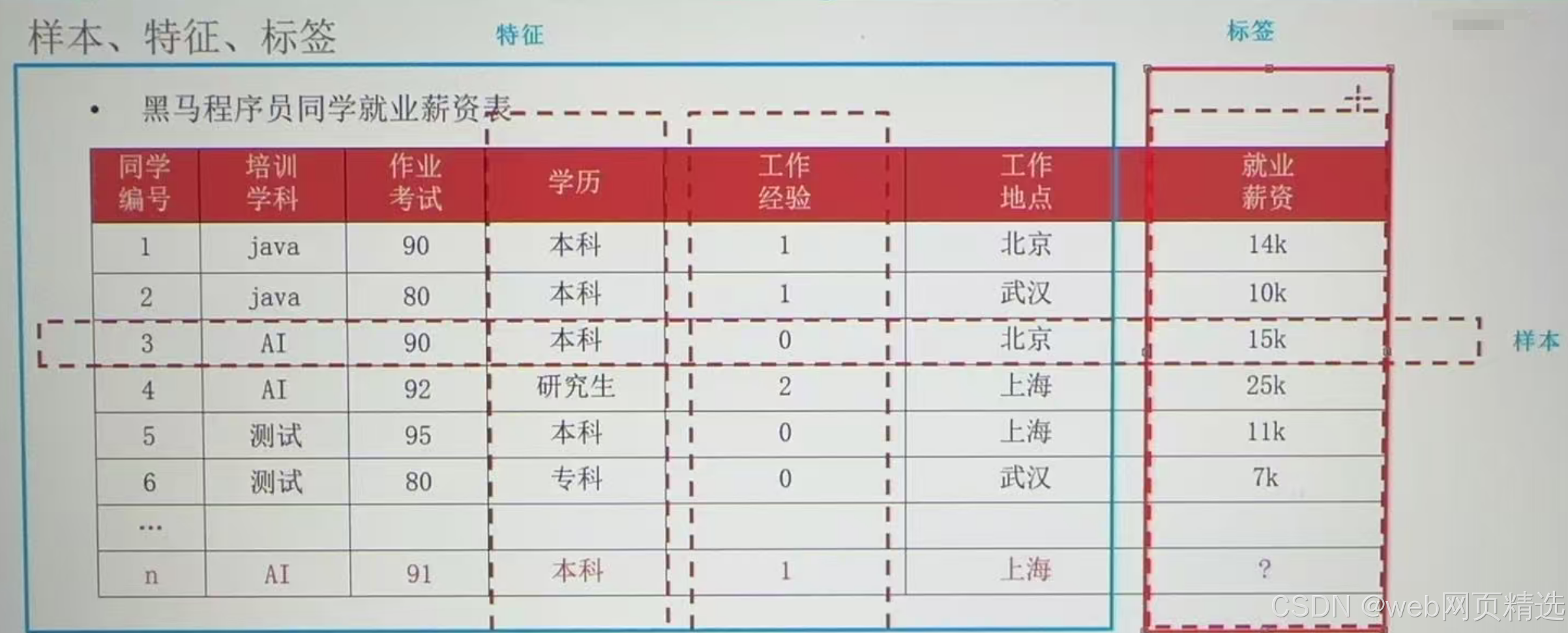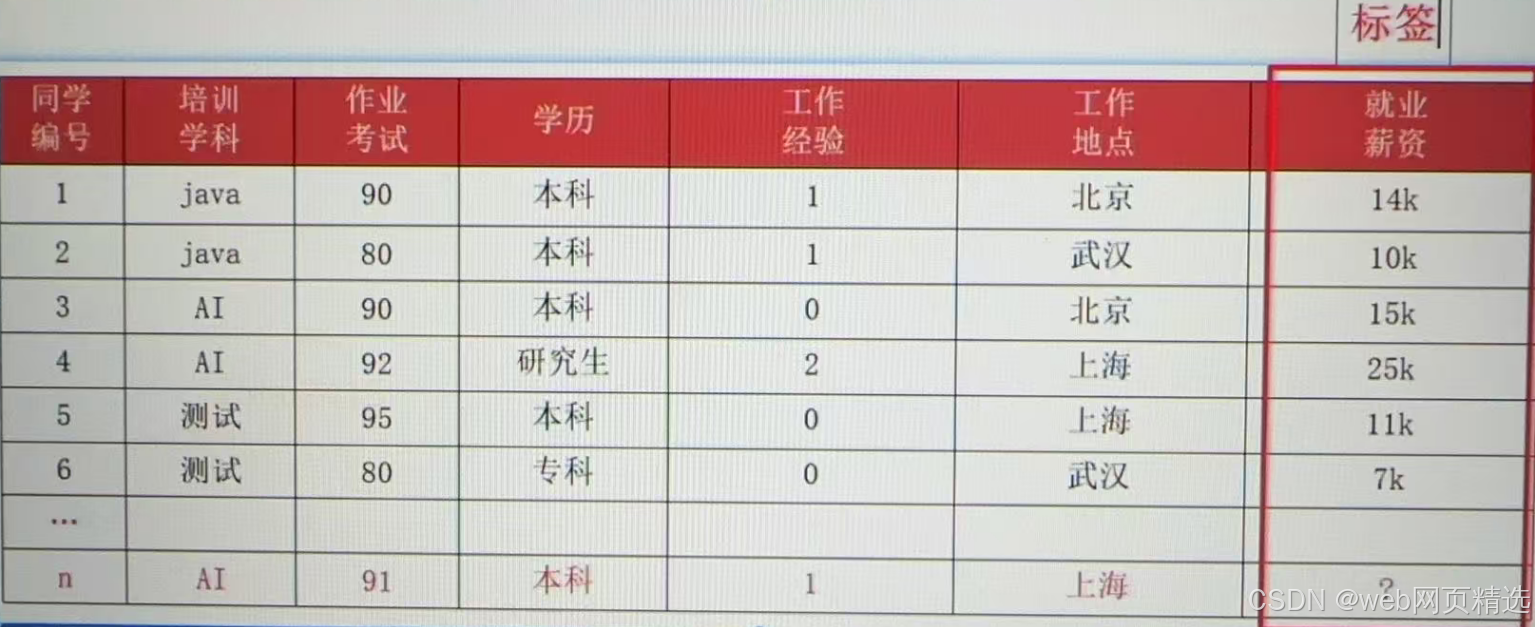 标签/目标(label/target):模型要预测的那一列数据。本场景是就业薪资