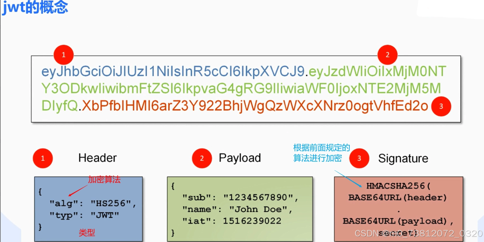 - 结构 :由Header(头部,算法/类型)、Payload(载荷,用户信息/声明)、Signature(签名,防篡改)三部分组成,以