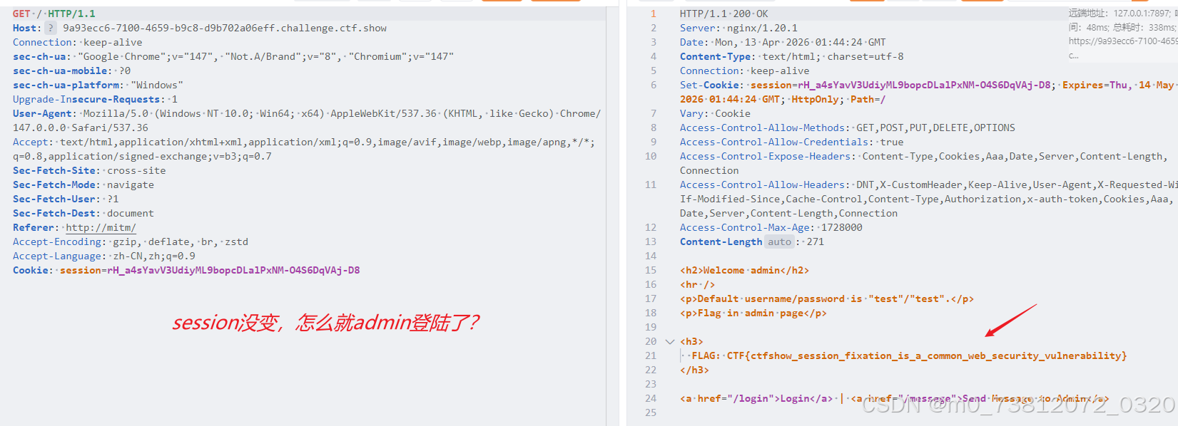 原因 :因为网站登录后没有更换sessionid,你用test拿到的sessionid被管理员登录后绑定成了admin权限,你再用这个sessionid访问就直接变成管理员了。