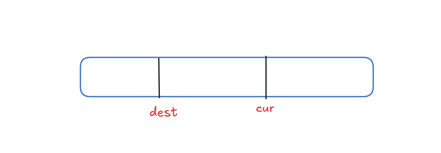 第一步:我们先定义两个指针,一个是cur(从左向右遍历数组),一个是dest(已处理的区间的最后一个元素位置)