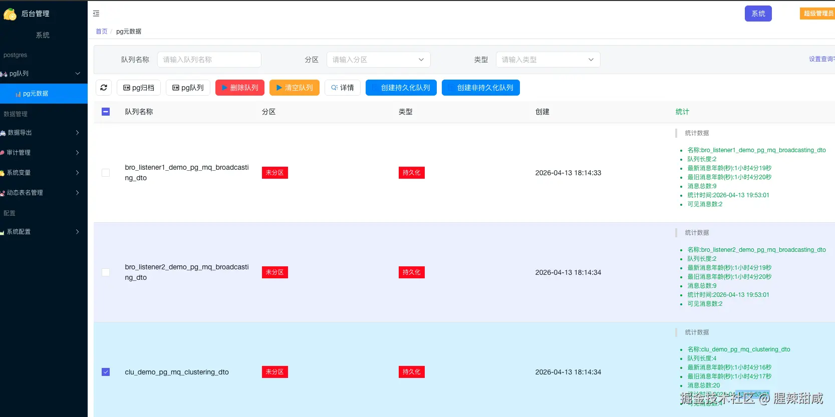 pgsql-ext-spring 提供了一个简洁的 Web UI 界面,方便开发者管理队列:
