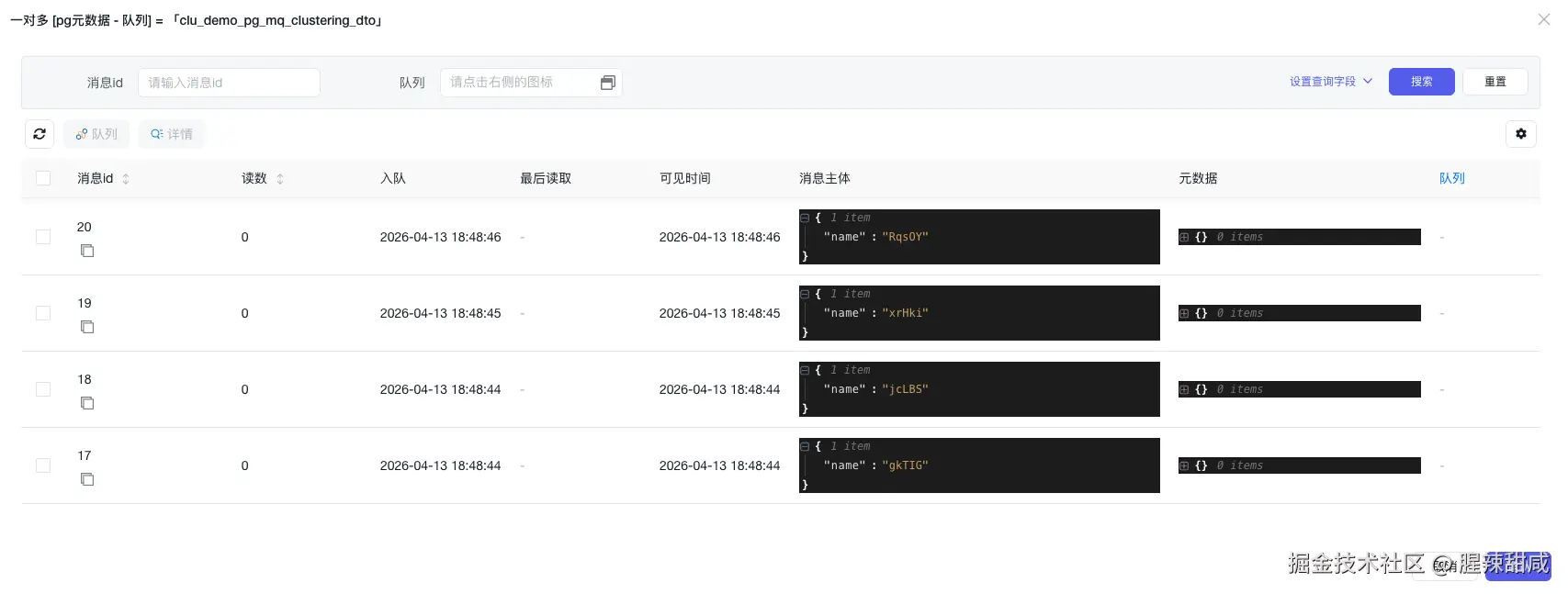 项目会自动创建和管理 pgmq 所需的表结构,无需手动执行 SQL 脚本。