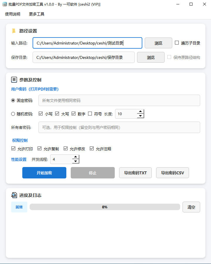 【批量PDF文件加密工具】用于批量为 PDF 文件设置密码与权限限制,支持遍历子目录、保持原路径结构、并发处理,以及随机密码记录导出(TXT/CSV)。适合合同资料、投标文件、内部培训材料、交付文档等"需要控制传播与权限"的场景。