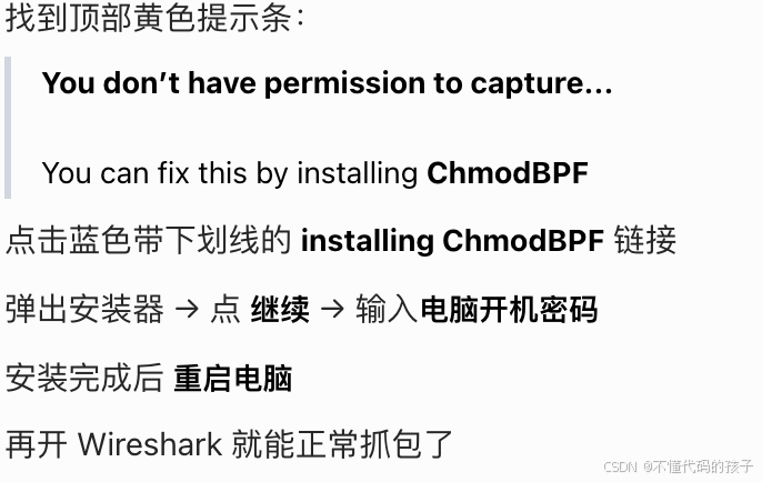 按提示的官方方法,安装 ChmodBPF 即可永久修复。