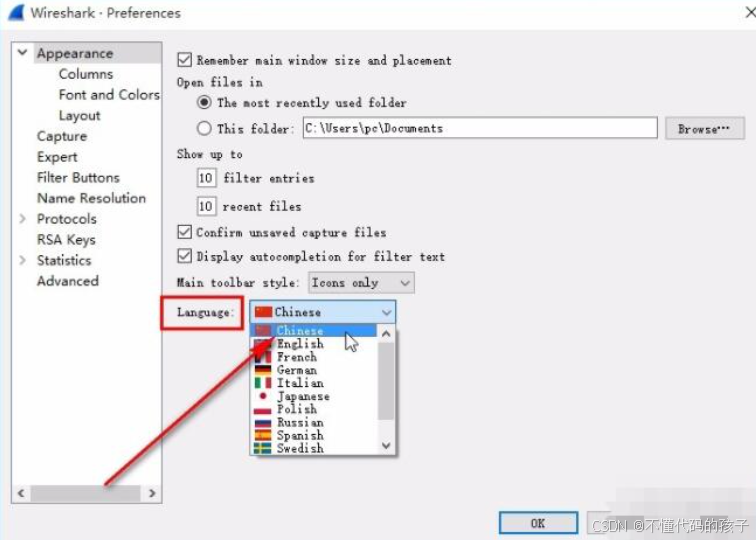 点击 OK,重启 Wireshark 后界面就变成中文了。