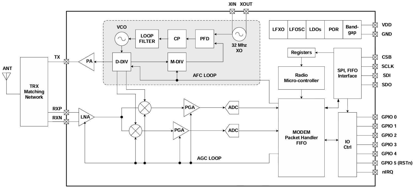 如上述功能框图所示,CMT2310A采用了LNA+MIXER+IFFILTER+LIMITTER+PLL的低中频结构来实现1GHz以下频率的无线接收功能;