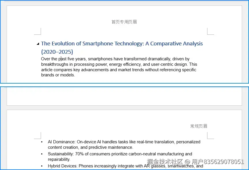 某些文档需要首页使用特殊的页眉页脚,或者首页不显示页眉页脚。可以通过以下方式实现: