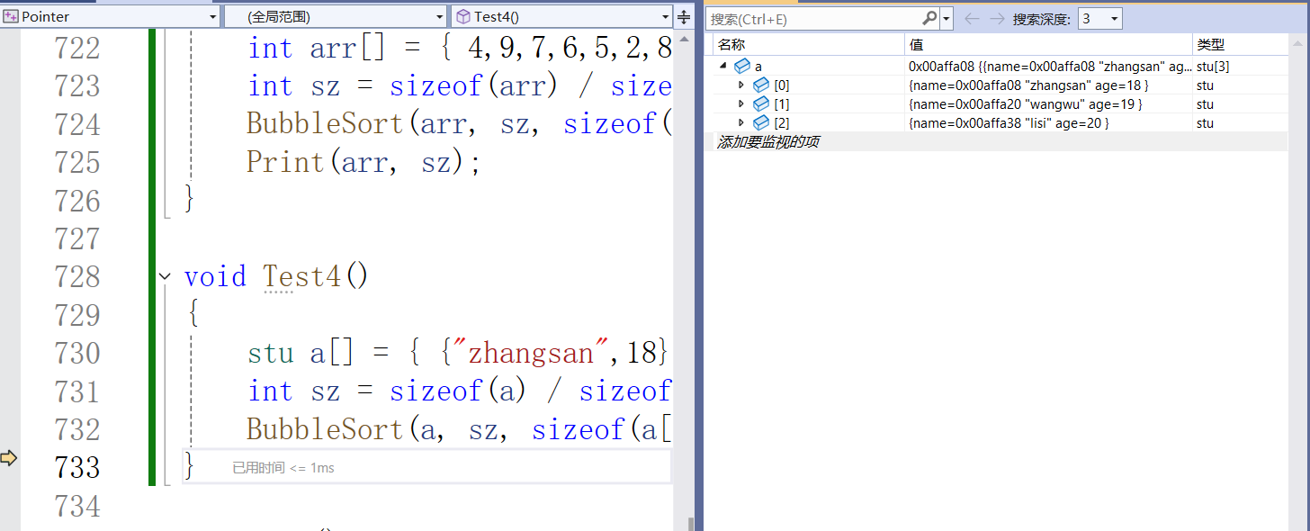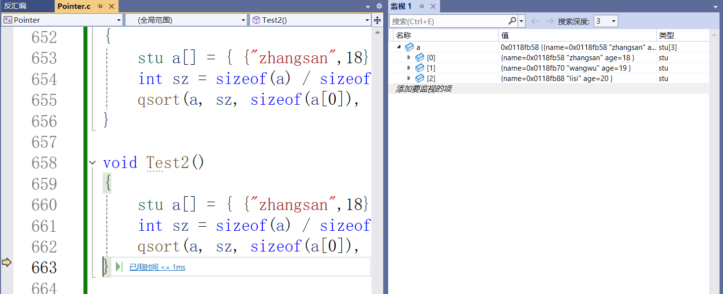 stu a[] = { {"zhangsan",18},{"lisi",20},{"wangwu",19} };