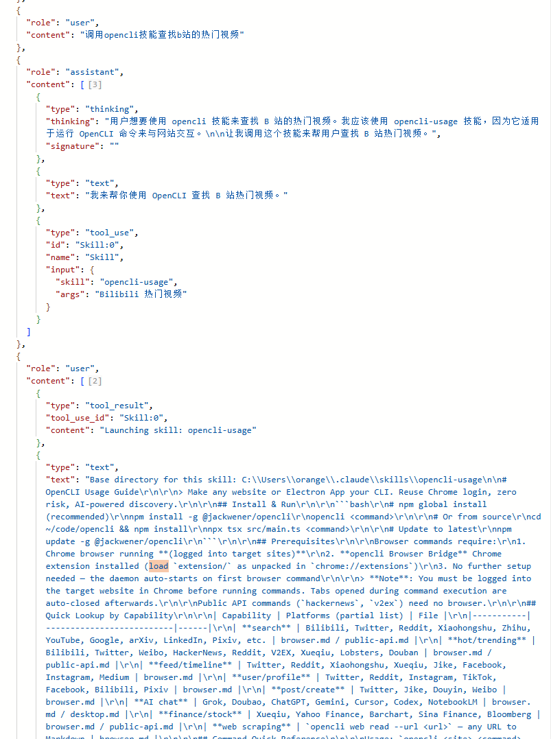 - skill工具调用opencli-usage技能,返回了技能的详细描述,渐进式披露技能内容