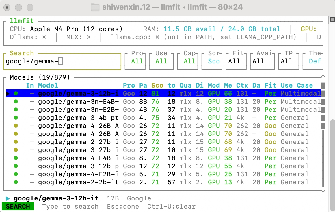 会弹出交互界面,搜索你感兴趣的模型(google/gemma4或qwen/qwen3.5),看Fit一栏就好:Perfect、Good都能流畅跑。