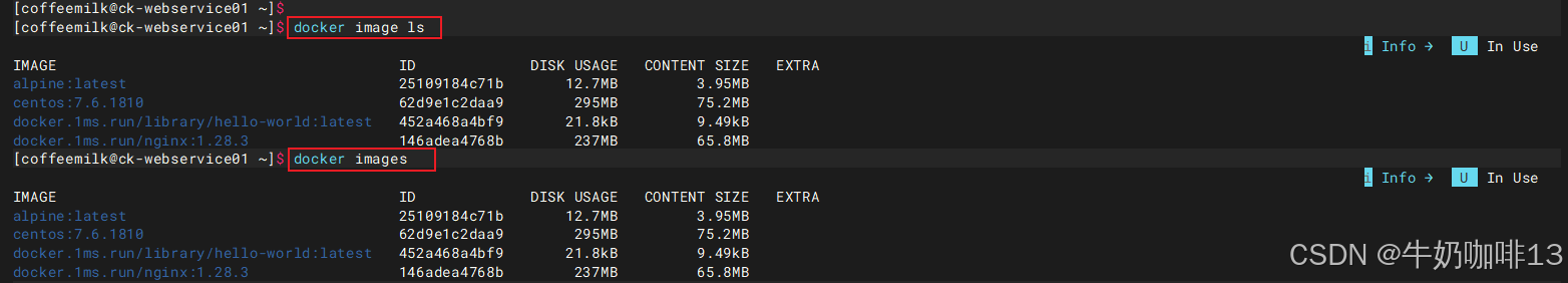列表包含了 仓库名、标签、镜像 ID、创建时间 以及 所占用的空间【镜像ID是镜像的唯一标识,一个镜像可以对应多个标签】。
