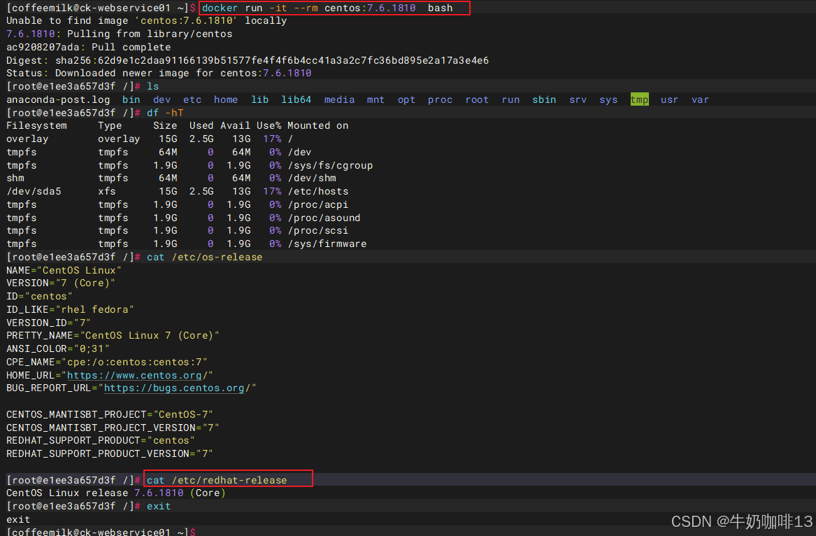 | bash | 放在镜像名后的是命令,这里我们希望有个交互式 Shell,因此用的是 bash。 进入容器后,我们可以在 Shell下操作,执行任何所需的命令。 #查看系统版本命令 cat /etc/redhat-release #退出容器命令 exit |