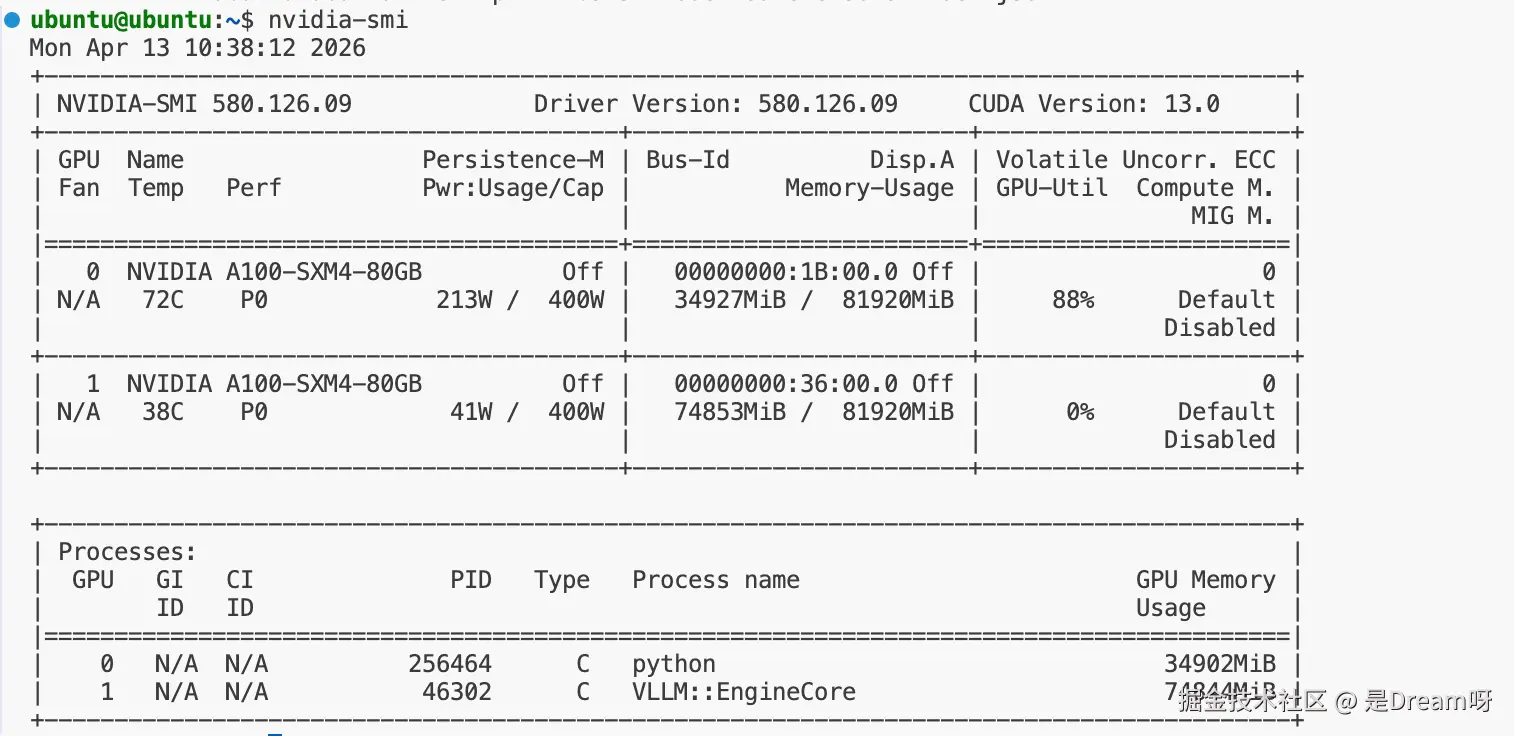 本文实验基于一台 Ubuntu 服务器完成,硬件侧使用 NVIDIA A100 80G GPU。部署前,服务器已完成 NVIDIA 驱动、Docker 与 NVIDIA Container Toolkit 的安装配置;模型运行采用 Gemma 4 专用 vLLM 镜像,目标模型为 google/gemma-4-31B-it,本地模型文件已提前准备完成: