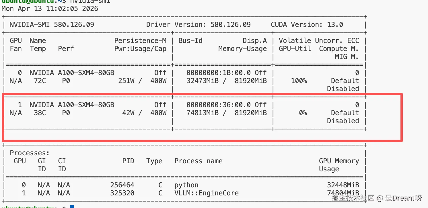 这里因为我的A100集群中有两张卡,第一张卡有别的用途,为了保证持久稳定的运行,我们只将模型绑定在第二张 GPU: