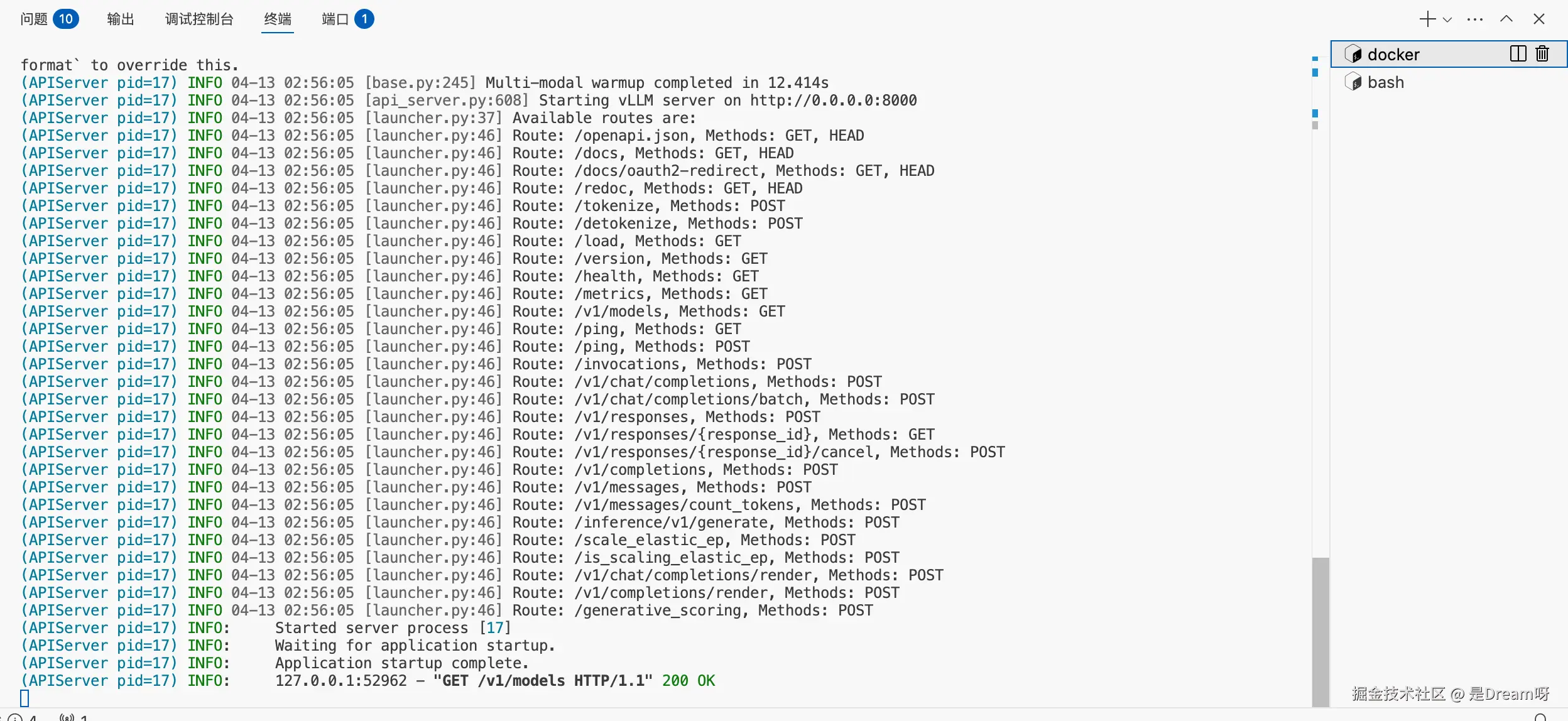 这说明服务已经启动,OpenAI-Compatible API 正常工作。