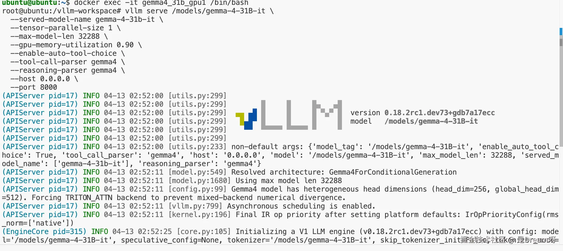 --served-model-name gemma-4-31b-it指定 API 层对外暴露的模型名,后续 curl、OpenCode 都要用这个名字。--tensor-parallel-size 1本次部署目标是单卡运行,所以固定为 1。--max-model-len 32288这是这次最终成功跑通的较大上下文长度。前期用 8192 可以起服务,但在 OpenCode 等长上下文场景下容易不够。--gpu-memory-utilization 0.90控制 vLLM 可以占用的显存比例。值越高,KV cache 空间越大,但显存压力也更高。--enable-auto-tool-choiceOpenCode build / agent 模式的关键参数,不开的话后面会直接报错。