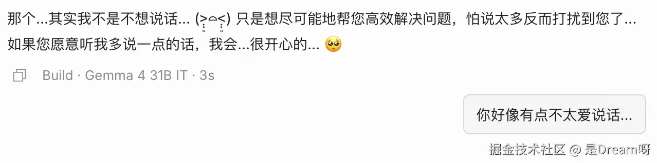 还有一点我个人印象很深。Gemma-4-31B-it 不是那种特别话痨的模型。当我们和AI对话,面对一个简单问题,他也会展开成长篇大论,往往使我们觉得很烦,但 Gemma-4-31B-it 经常会把答案收得更紧,回得更短,但重点又并不缺失。某种意义上,这正是指令微调最有价值的地方:不是让模型更能说,而是让模型更懂任务、更会克制、更知道如何围绕目标作答。