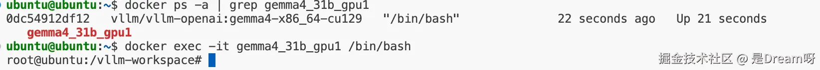 0dc54912df12 vllm/vllm-openai:gemma4-x86_64-cu129 "/bin/bash" 22 seconds ago Up 21 seconds gemma4_31b_gpu1
