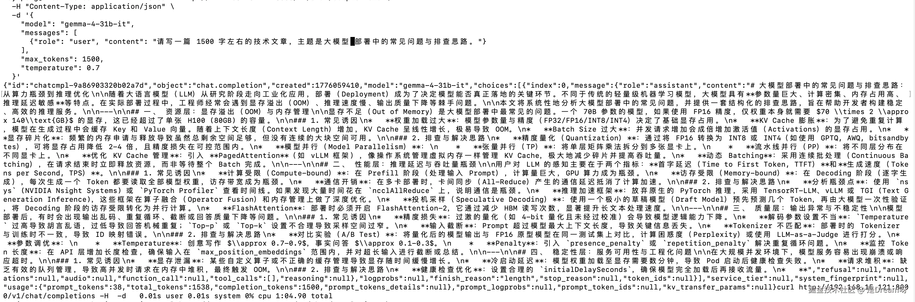 仅仅看回答质量还不够,部署完成后还需要关心一个很实际的问题:生成速度是否可以接受 。 这里我采用的是最简单、也最贴近真实服务使用场景的方式:直接通过 curl 访问 /v1/chat/completions 接口,并在命令前加上 time,统计一次较长输出请求的整体耗时。